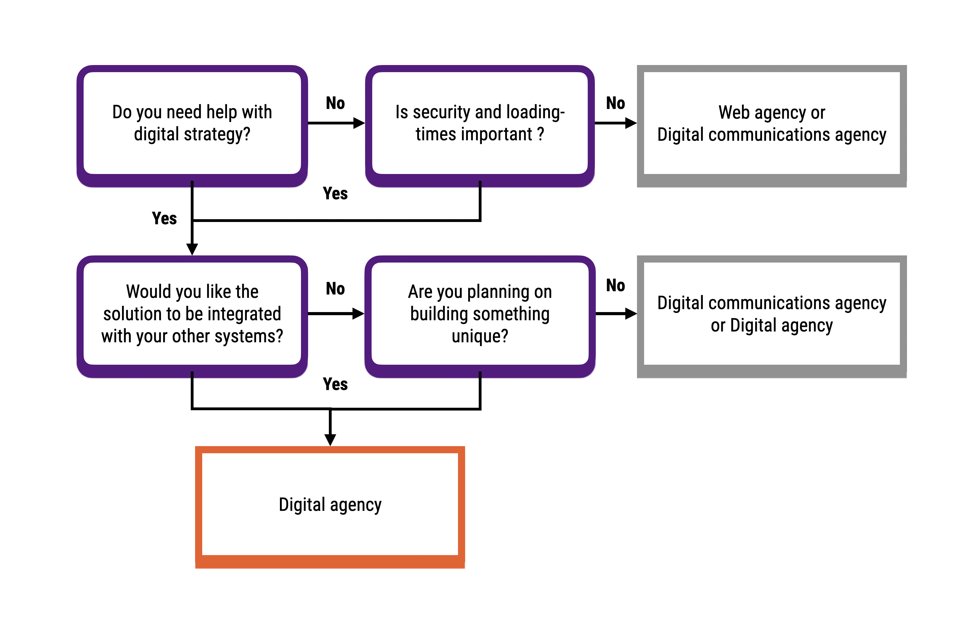 A digital communications agency is, as the name suggests, a company that focuses on helping other companies with their digital communication. They usually have a background in advertising and very rarely employ in-house developers.